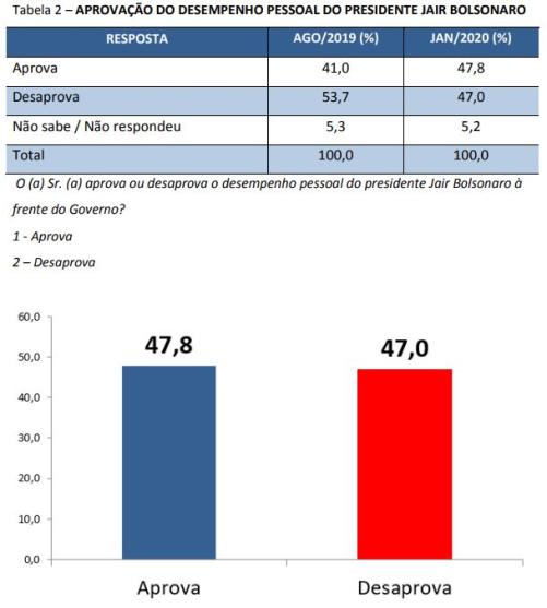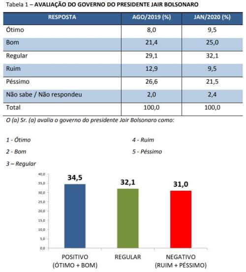 O resultado mostra uma melhora nos indicadores do governo em relação à última pesquisa divulgada pelo instituto. Em agosto do ano passado, o governo Bolsonaro era visto como positivo por 29,4% dos eleitores e como negativo por outros 39,5%. O levantamento foi realizado entre os dias 15 e 18 de janeiro, com 2.002 pessoas, em 137 municípios.