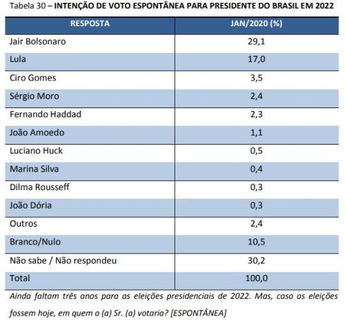 A pesquisa também perguntou aos entrevistados em quem votariam para as eleições presidenciais de 2020. No cenário espontâneo, em que não são apresentados nomes de candidatos aos eleitores, Bolsonaro lidera, com 29,1% das menções. Na segunda posição, aparece o ex-presidente Luiz Inácio Lula da Silva (PT), com 17%.