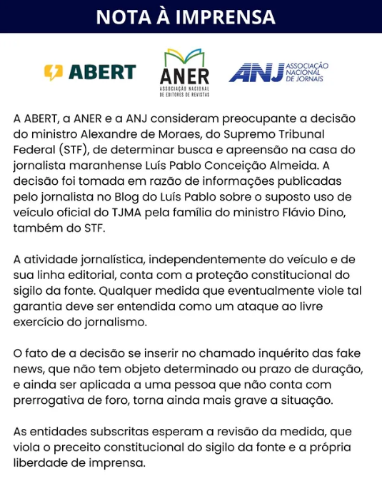 A Associação Brasileira de Emissoras de Rádio e Televisão (ABERT), a Associação Nacional de Editores de Revistas (ANER) e a Associação Nacional de Jornais (ANJ) consideram preocupante a decisão do ministro Alexandre de Moraes, do Supremo Tribunal Federal (STF), de determinar busca e apreensão na casa do jornalista maranhense Luís Pablo Conceição Almeida. A decisão foi tomada em razão de informações publicadas pelo jornalista no Blog do Luís Pablo sobre o suposto uso de veículo oficial do TJMA pela família do ministro Flávio Dino, também do STF.