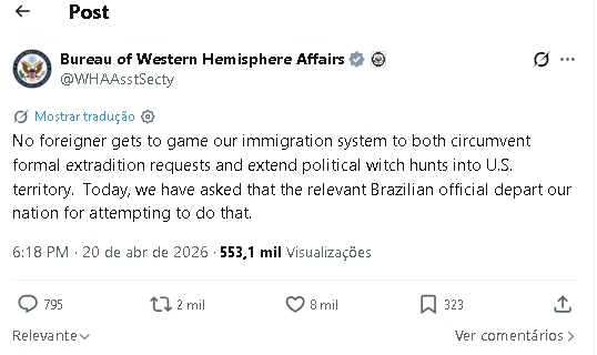 Segundo publicação feita pelo Escritório para o Hemisfério Ocidental do Departamento de Estado dos EUA na rede social X, a medida estaria relacionada a questões envolvendo o uso do sistema de imigração norte-americano e a atuação de estrangeiros em processos internos.